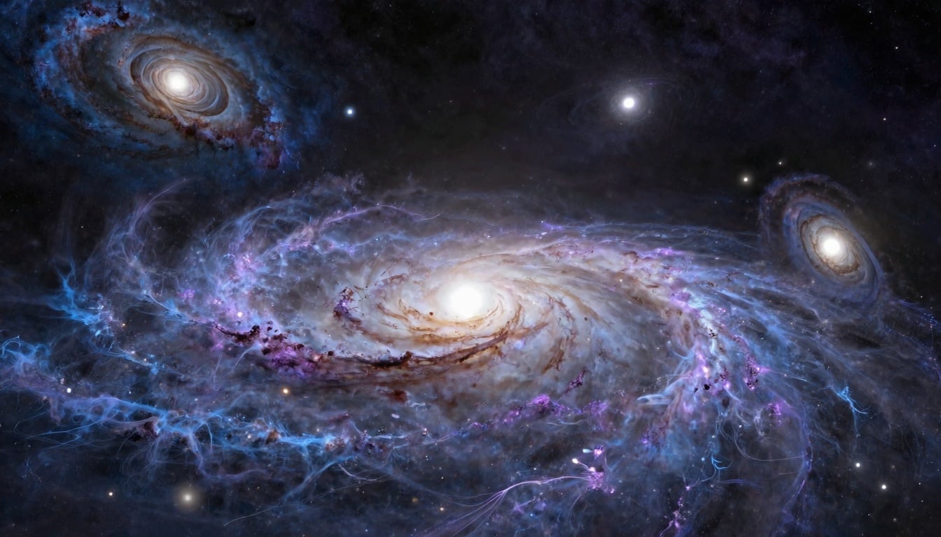 Dark matter differs from dark energy. It pulls, not pushes, making up 27% of the cosmos. We sense it through gravity's tug on visible stuff. Galaxies form in dark matter halos, like glue holding stars. Without it, expansion would scatter everything. Simulations show how these halos clump early on, then spread as space grows. The Bullet Cluster proves it—hot gas collides, but gravity bends light elsewhere, tracing dark matter. It scaffolds the web of cosmic structure amid expansion. Dark energy stretches this web, while dark matter knits the threads.